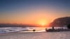 Fredfyldte strandhytter i solnedgangen