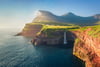 Rejsen begynder med direkte fly fra Danmark til Vágar på Færøerne. Allerede ved ankomsten fornemmer du øgruppens vilde skønhed – dramatiske fjelde, grønne bakker og det konstante nærvær af havet. Du afhenter din lejebil i lufthavnen og har resten af dagen til at udforske Vágoy i dit eget tempo. Vi anbefaler en tur til Gásadalur – en af de mest ikoniske bygder på Færøerne. Her kan du følge en afmærket natursti til udsigtspunktet over den savtakkede ø Tindhólmur og det imponerende vandfald Múlafossur, der styrter direkte ned i Atlanterhavet. Det er en fredelig og smuk start på dit færøske eventyr.